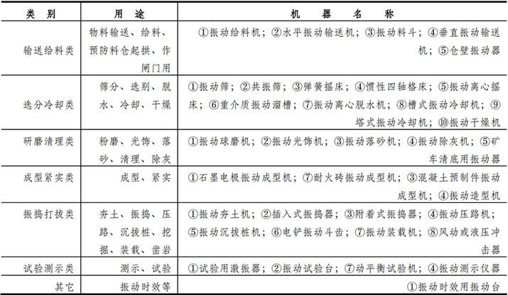 表 l―1 按用途對振動機械進行了分類,並列舉了各種常見振動機械的名稱。